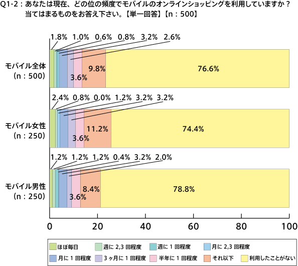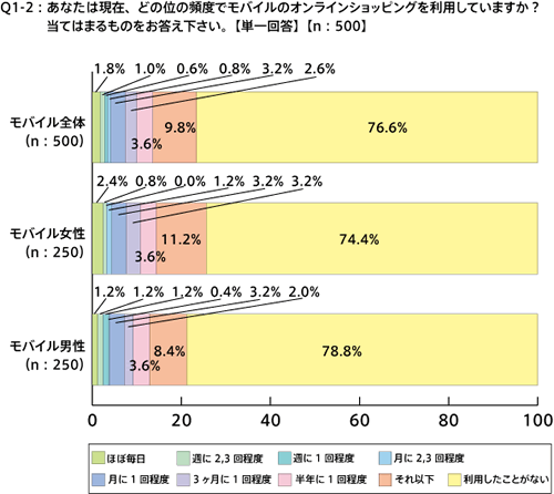 Q1‐2では、どの位の頻度でモバイルのオンラインショッピングを利用しているか尋ねたところ、女性では「利用したことがない」が74.4%と最も多く、男性でも78.8%と同様の結果になった。