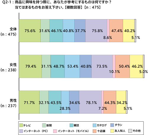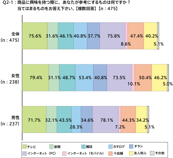 Q2‐1で商品に興味を持つ際に、参考にするものは何か尋ねたところ、女性では「テレビ」が79.4%と最も多く、次いで「インターネット(PC)」が73.5%となり、男性では「インターネット(PC)」が76.1%と最も多く、次いで「テレビ」が71.7%となった。
