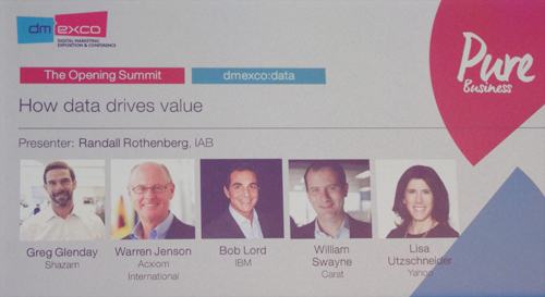 次に参加したのがオープニングサミット。Shazam CEO、Acxiom International CFO、IBM CDO、Caratのグローバルプレジデント、Yahoo! CROによる40分のパネルディスカッションになっている。タイトルは「How data drives value」。ここでは、5社の取り組むデータ活用を要約して列記したい。