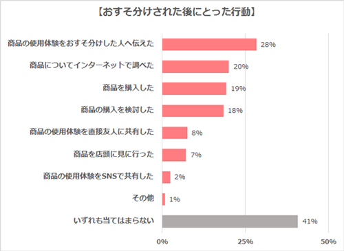 おすそ分けを「体験の伴う口コミ」と定義すると、その影響力はどれほどのものなのでしょうか? おすそ分けを受けた人の行動を見ていくと、約20%の人がおすそ分けされた商品を購入した経験があると回答しています。また購入まで至らないものの、「商品の購入を検討」「商品について調べる」と回答した割合もそれぞれ20%ずつ存在しており、購入意欲の向上に貢献していることがわかります。