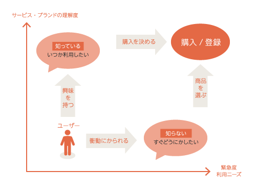 つまりこのダイアグラムは、広告領域だけで完結するものではなく、LPやサイトの導線まで一括で表現するものになります。また、ユーザーは広告を含め複数の情報に触れることで、商品理解とモチベーションが向上していった結果、コンバージョンに至るのです。