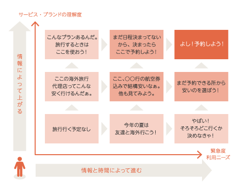 瞬間的に何を期待し、そこで何を得るのか、その情報蓄積の結果コンバージョンに近づく。このダイアグラムをベースに、実際のキャンペーン設計やクリエイティブに落とし込んでいます。