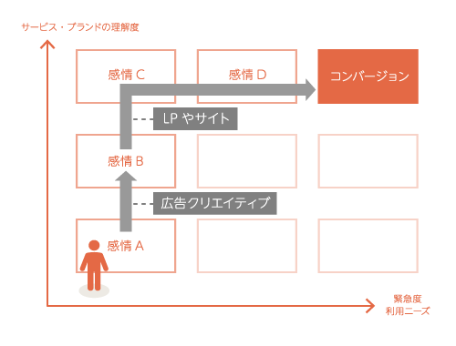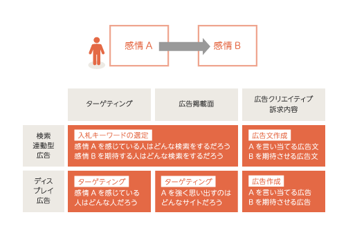 検索連動型広告におけるキーワード、ディスプレイ広告のターゲティングおよび掲載面は、このダイアグラムの中にある感情にあたります。そして、感情Aから感情Bに変移させるためにクリエイティブが存在します。感情Bから次の感情Cを感じさせるためにLPやサイトが存在します。