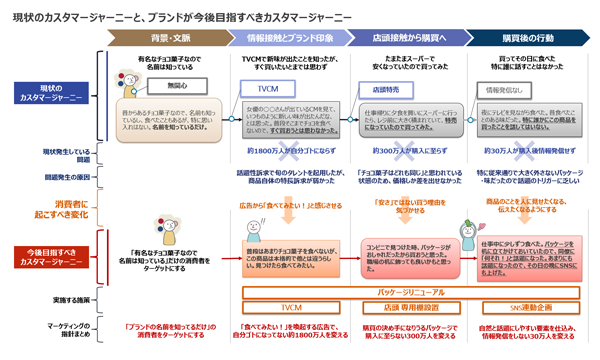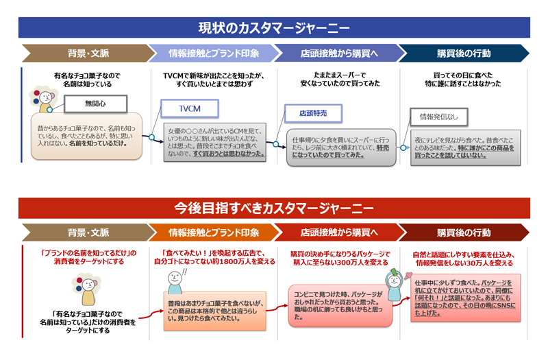 そして、現状のカスタマージャーニーをどう変化させればよいか、その変化を起こすためにはどの顧客接点でどんなストーリーを語ればよいか、どのような顧客体験により達成できるか、顧客体験が向上することでどの位の集客や売上が期待できるか、という順に戦略を立案していきます。つまりこの2本のジャーニーマップを埋めていくことが、「カスタマージャーニーを作ること」です。