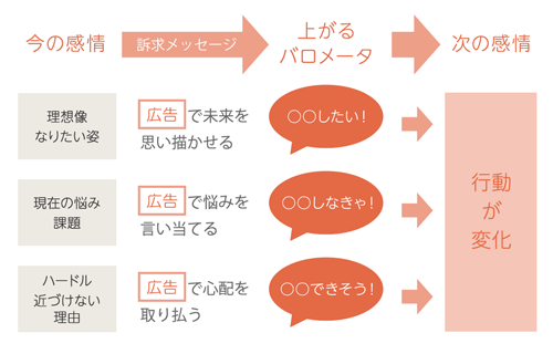 上の図のように、それぞれの感情に対して、それぞれ異なったアプローチをすることにより、「したい!」「しなきゃ!」「できる!」のバロメーターが上がり、商品購入を検討する感情に変わっていきます。