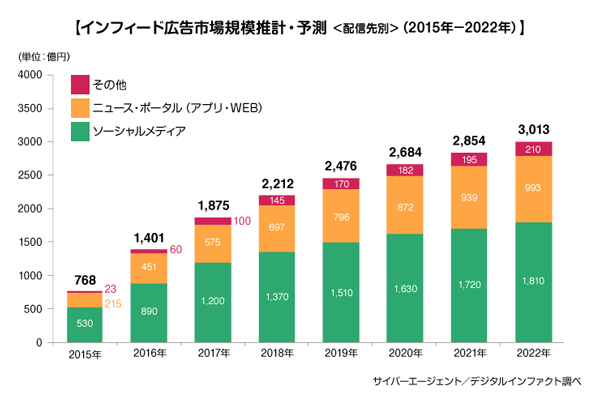 2015年からインフィード広告の提供を開始したヤフーのYDNもまた売上を順調に伸ばし、市場全体のけん引に一役買った。スマートニュースや、グノシーなどのアプリ媒体も売上成長を続けており、市場の厚みを作っている。