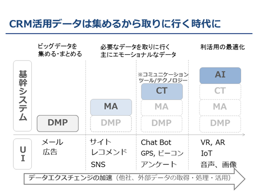 顧客データの取得や活用の仕方にも、現在はDMPやMAといったツールの導入が進んでいる。さらにこれからのトレンドとしては、IoTによるモノからのデータ取得や、AIを活用したデータ処理などが、エンゲージメント構築の味方になりそうだ。塩谷氏は「CRMの考え方は、それこそ商店街の八百屋さんにもあるもので、新しい概念ではありません。我々としては、顧客にとって心地よいCRMを前提に、それを実現できる策は何かという視点でテクノロジーを取り入れていきたいと思います」と語る。