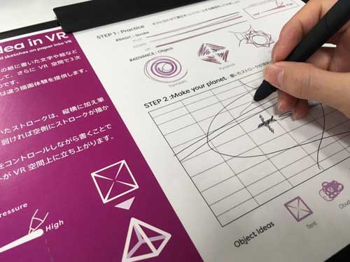 参加者がワコム製ペンタブレットを使って、球体の展開図に「雲」や「オーロラ」など好きな絵を描くと、その絵が球体(惑星)の周りにデザインされ3DCGとしてVR空間上に浮かび上がります。WHITE製の操作機能のあるスマホVRゴーグル「MilboxTouch」を利用すれば、VR空間上の惑星を動かすことも可能です。