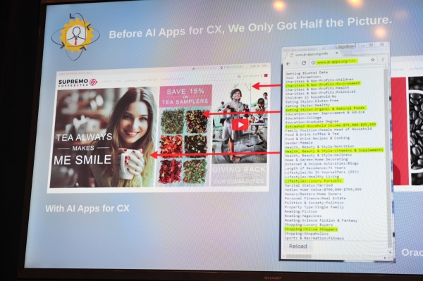 AIA for CXではまず、オラクルのDMPである「Oracle BlueKai」のプロファイルにアクセスして彼女のデータをリアルタイムに引き出す。そして彼女が「フィットネス」「健康」「栄養」そして「彼女の経済状況」といったデータを把握し、彼女への訴求方法を検討する、という仕組みだ。