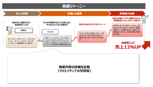 まず自社の提案やソリューションの実績を数値に落とし込みます。「潜在顧客の顕在化25%UP」や「集客率50%UP」などです。そしてこれらの”数値”が過去事例で得られたジャーニーを書きだします。つまりクライアントの課題をどう解決し、ビジネスの成果がどう変化したのかという実績のストーリーを、図で紹介するわけです。