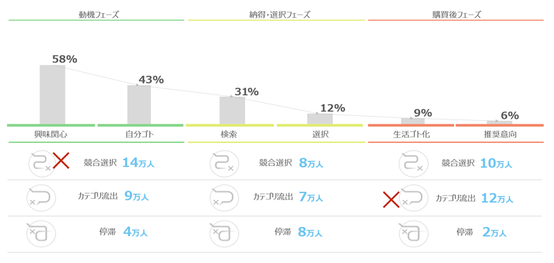 図:現状のカスタマージャーニー上の問題箇所と機会損失のストーリー