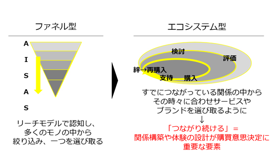 その理由は「生活者の購買意思決定行動が変化しているから」に他なりません。生活者は、以前はファネル型の購買行動(数多くの商品から、段階的に検討し最終的に買うものを選び取っていく)が主だったのですが、現在はエコシステム型、つまり、既につながっている関係や接点の中からその時々に合わせ商品やサービスを選び取るようになっているのです。