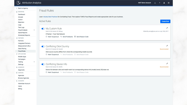 このソリューションはアドフラウドだと思われるトラフィックを特定しアドフラウドの統計分析を表示するだけでなく、デバイスや位置情報やキャンペーンのデータをもとにアドフラウドを行っているトラフィックソースを推定して、アドフラウドを除外するルールを自動でリコメンドしてくれるというもの。このルールをマーケターが承認すると以後はアドフラウドとしてフィルターして除外される。いわば、「守りのMA」としての役割をはたすわけだ。