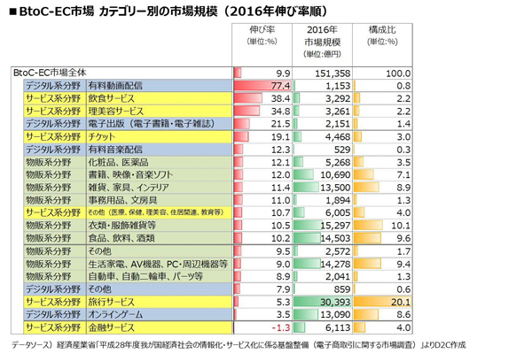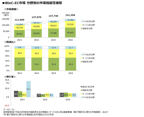 2016年の市場規模では、「物販系分野」が最も大きく約8兆円(全体の52.9%)、次いで「サービス系分野」5.3兆円(同35%)、「デジタル系分野」約1.8兆円(同11.7%)となっています。