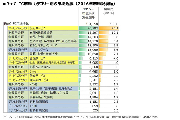 報告書の中では、更に物販系分野(9つ)、サービス系分野(6つ)、デジタル系分野(5つ)の計20のカテゴリー(=市場)に細分化した数字も掲載されています。そちらをみていきましょう。まずは市場規模順に並べてみました。敢えて、分野ごとではなく全て並列に並べています。