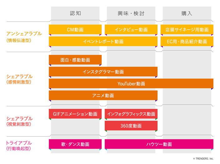 今回は主にInstagram動画について取り上げましたが、一言で「動画」といってもコンテンツの種類・尺の長さ・投稿するプラットフォーム等によってその特性はまったく異なります。トレンダーズが2017年6月に設立した「動画マーケティング戦略室」では多様化する動画のコンテンツとフォーマットをユーザーの拡散モチベーションとマーケティングファネルによって以下に分類しています。
