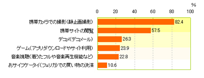 携帯電話の以下の機能の利用について尋ねたところ、『携帯カメラでの撮影(静止画撮影)』(82%)が最も多く、次いで『携帯サイトの閲覧』(58%)、『デコメ(デコメール)』(26%)となった。「流行プレジャー型」が携帯の様々な機能やサービスを駆使し、生活の一部にしていることが伺える。