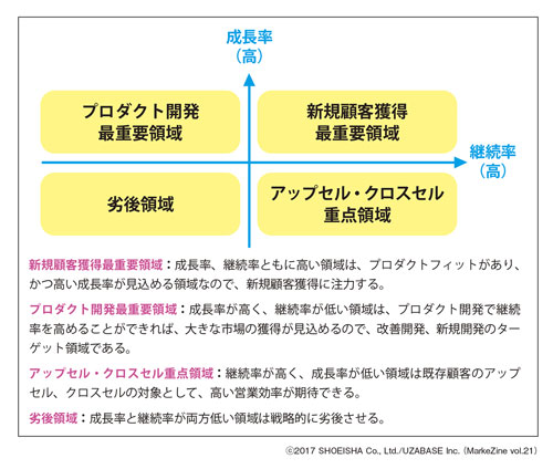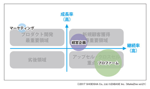 図表4から、「マーケティング」は、現在の売上規模は小さく継続率も高くないものの、成長率は非常に高く、継続率さえ改善できれば大きな市場獲得が見込めることがわかります。つまり、改善開発のメインターゲット領域です。「経営企画」は、売上規模がある程度大きく、成長率、継続率ともに高いので、積極的に新規顧客を獲得していきます。また「プロファーム」は既に大きな売上があり継続性も高いですが、ほぼすべてのターゲット企業に導入済みで今後の新規企業獲得は限定的なので、アップセルにフォーカスしていきます。