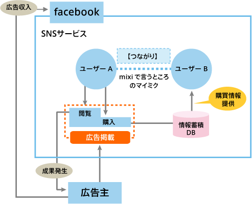 どのようなものなのかというと、facebookのSNS(Social NetWorking Service:日本だと、皆さんもご存じのmixiが有名)内で繋がっている友人が、facebook内でリコメンドされた商品を購入すると、その情報がつながりのある友人に公開されるというものです。