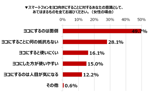 スマートフォンをヨコにしての動画視聴に抵抗がある理由を女性に聞いたところ、「面倒」という答えが約半数と圧倒的に。また、20代女性では20.0%が「人目が気になる」と回答しています。一体なぜ、ヨコにするのが「面倒」で「人目が気になる」のでしょうか。
