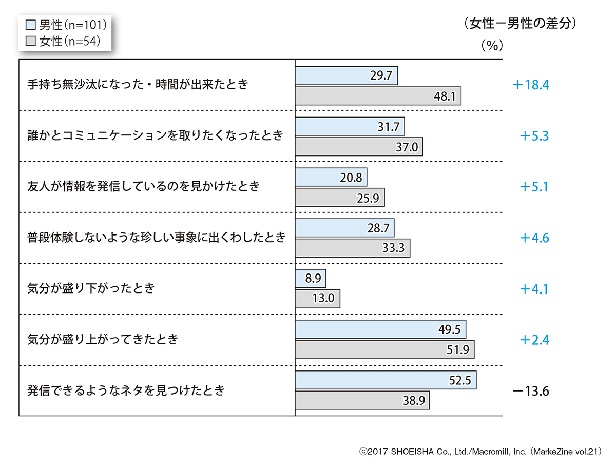 ライブ配信は、計画的な場合と、ふとした瞬間に思いつきではじめる場合があるだろう。配信のタイミングを男女別に見ると、女性に特徴が現れた。突発的な発信は、計画的な発信の2倍強と、多くの女性が突発的にライブ配信をはじめているという実態がわかった(図表5)。