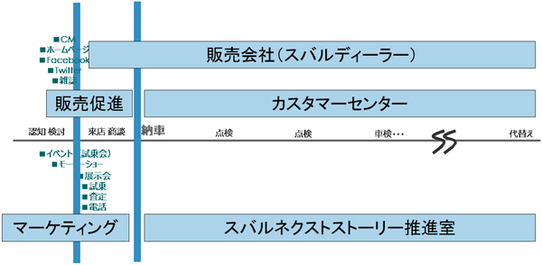 たとえば、販売促進部門が認知から購入までを担当し、購入以降の利用においては、アフターサービスを行うカスタマーセンターと全国のスバルディーラーが担当する。小島氏の所属するマーケティング推進部は、ディーラーも含めた顧客接点全体に対し、認知や商談・購入体験の支援を行う。また、スバルネクストストーリー推進室は、購入以降の顧客全体に向けての施策シナリオを描く。
