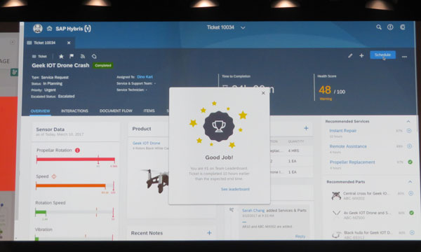 実際のデモでは、ドローンが届き、使い始めたところ故障。IoTセンサーによりプロペラに問題があることがわかったCTI.IOのサービス担当が、ユーザーに電話する。そして故障箇所を指摘し、部品の交換を行う手続きを進める。合わせて、次の故障や問題に備えて保証パッケージへの加入を勧めた。