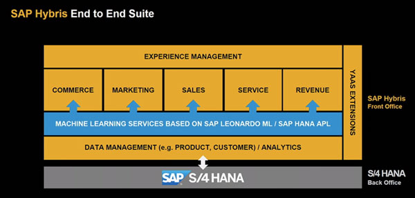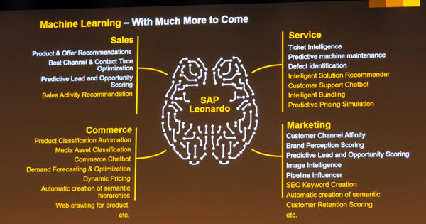 SAP Hybrisの強みは、これら各クラウドの連携(スイートアプローチ)とSAPがバックエンドで持つシステムとデータだ。データ活用の鍵を握るのは機械学習で、イベント会期中、Marketing、Service、Sales、Commerceの各クラウドの機能での機械学習の利用を進めていくことを明らかにした。