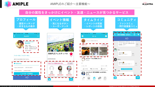 「AMIPLE」はライブやスポーツ観戦などのイベント同行者を探せるサービスで、趣味によってつながる「インタレストグラフ」と呼ばれる仕組みだ。「AMIPLE」が一番得意としているのはサマーソニックなどの音楽フェスだという。
