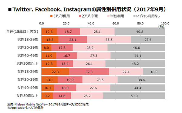 - 女性18-29歳、女性30-39歳では、「3アプリ(Twitter+Facebook+Instagram)併用者」が最も多い