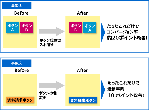 このアクションはサイトリニューアルを行うとかデザインを一気に変えるといった大々的なものではありません。私の経験上『ちょっとした改善』で予想以上の効果を生み出すことは非常によくあることです。『ちょっとした改善』とは、ボタンの色や位置を変えたり、ファーストビューのメッセージを少し変えて目立たせたり、といった時間もコストもあまりかからないようなものです。