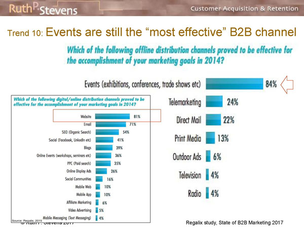 イベントはいまもなお、最も効果的なBtoBマーケティングのチャネルです。「時代はデジタルだ、ソーシャル対応を進めよう、デジタルマーケティングがすべてでイベントなんて過去のもの」という人もいますけれど、大間違いですよ。現に皆さん、今日のイベントに来ているじゃないですか。