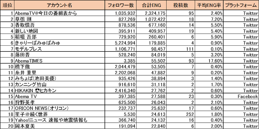 ランキングには、元SMAPの3名に加えて、サイバーエージェントの藤田晋社長、お笑い芸人のカンニング竹山氏、元大阪市長の橋本徹氏、そして、国内で最も情報拡散力を持つインフルエンサーの一人であるヒカキン氏など、多種多様な顔ぶれが並びます。