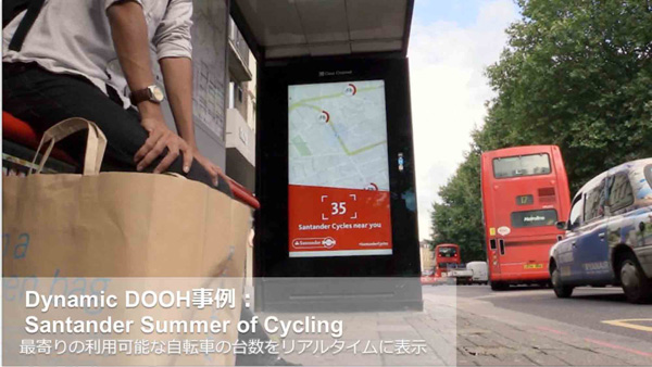 自転車シェアリングを使う時、レンタル拠点の場所に何台の自転車が残っているかがわかっていないと、行ってみたのに利用できない事態が起き、利用者が減ってしまいますよね。そこで、自分の最寄りに近い拠点の在庫状況を“リアルタイムマップ”としてデジタルサイネージに出すことで利用率を高めました。結果、キャンペーン前に比べてブランド認知は19%、サービスの利用率は16%上がりました。