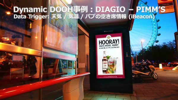 2つ目はイギリスの酒造メーカー、ディアジオのリキュールブランド「PIMM’S」のキャンペーン事例。デジタルサイネージが置かれている場所の最も近くにあるパブの空き状況をリアルタイムで教えてくれ、それだけでなく天気や気温に応じてクリエイティブを変えるというものです。