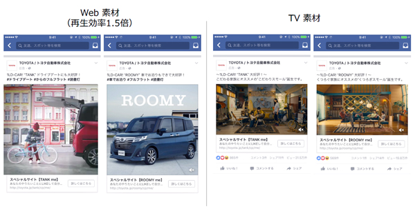 鈴木:属性を加味したマッチングというより、これはアルゴリズムの話になりますが、たとえば今年の事例だとトヨタ自動車のROOMY/TANKの広告で、テレビCMと同じ素材を使用した動画とモバイルに最適化した素材を使用した動画の2種類をFacebookに出稿しました。展開時期は2017年8月となります。モバイル用には、スマホで見ることを前提に縦横比を正方形にし、音声なしでもわかる内容の動画にするなどの工夫をしています。