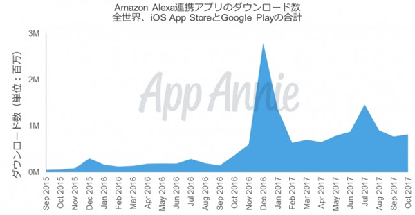 米国では、音声対応スピーカーと連携するAmazon Alexaアプリのダウンロード数が、50ドル弱のEcho Dotが発売された2016年10月から上昇傾向になり、 ホリデーシーズンとAmazonプライムデーの頃に急増したという。