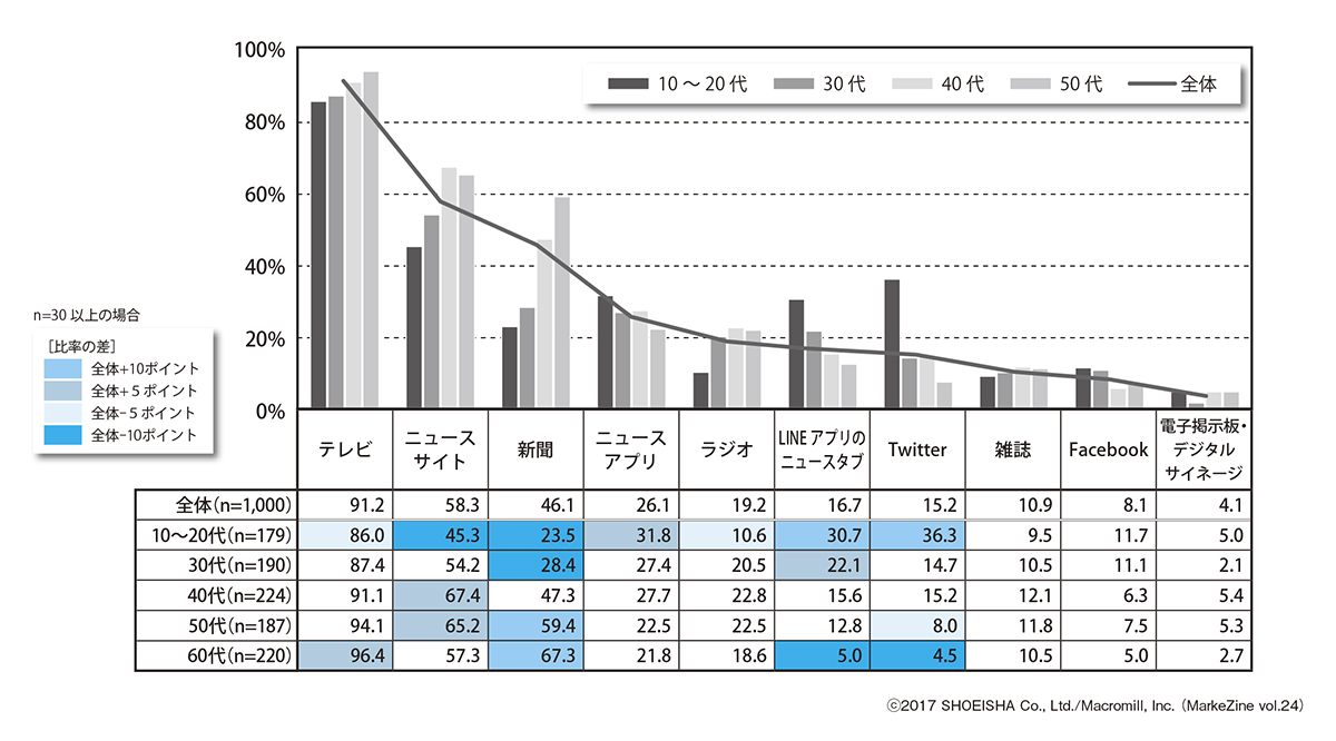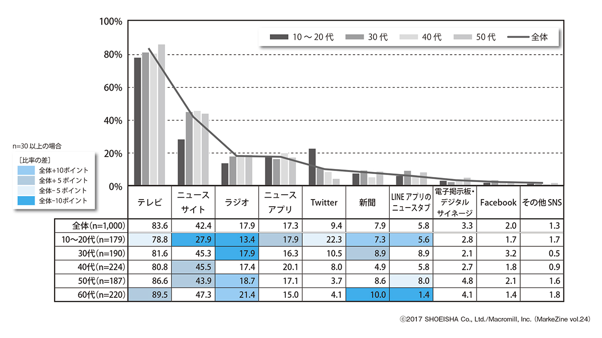 また、緊急性の高い情報を得る際の情報源のスコアを年代別でみると、ここでも若年層と中高年層での大きな傾向差が見られた。10~20代は「ニュースサイト」のスコアが低く、代わりに「Twitter」のスコアが高い。これら2媒体での50代以上とのスコア差は20%前後見られ、緊急時に確認する情報源の違いが表れている(図表4)。