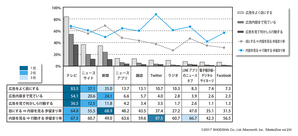 上記3つの指標に関して、ここでも「テレビ」が3項目すべてのスコアで突出して高く、影響力の大きさがうかがえる。一方、広告を目にしてから内容を見るまでの歩留まり率に注目すると、「新聞」が「テレビ」などを上回って69%と最も高くなっている。自動的に流れていってしまうテレビCMとは異なる紙媒体広告の強みが表れていると考えられる。また内容を見てから何かしらの行動をするまでの歩留まり率では、「Twitter」が88%と最も高く、広告の行動喚起という効果の面でも影響力の大きさが読み取れる。