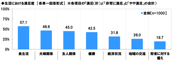 また、全回答者(1,000名)に、経済状況や将来に対する備え、食生活などについて、それぞれどの程度満足しているかを聞いたところ、『満足(計)』が最も高くなったのは「食生活」で57.1%だった。
