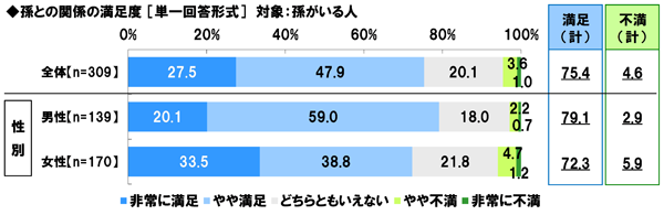 男女別に見ると、現在の生活に満足しているシニアの割合(「満足(計)」)は、男性43.8%、女性50.0%と、女性のほうが高くなった。