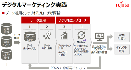 富士通でもプライベートDMPへ、20万人を超える顧客行動データと企業データの集約・一元化を行い、データ分析・活用、シナリオ策定、MAの活用によって、リードを育成し打率を高めていった。