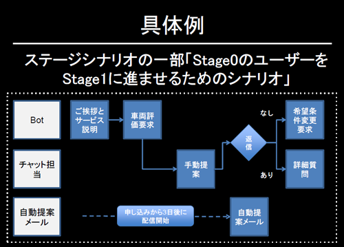 Bot・チャット担当・自動提案メールと3つのチャネルがあり、最初にBotで挨拶とサービス説明、車両評価の要求までを行い、その後とチャット担当が提案を行う。提案に対する反応がなければ、自動的にBotに対応が切り替わる。また、この間に自動で提案メールも配信が開始される。