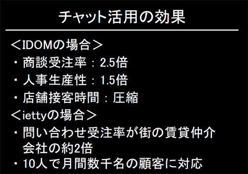 一方iettyでも、従来の店舗型賃貸仲介と比べ受注率が約2倍となり、チャット専門オペレーター10名で、数千人の対応ができるまでになった。