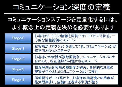 同社は、そのために、0から4までの5段階に分けた「ステージ」という定義を確立。行動データとアンケート、顧客の属性情報という3つのデータをもとにスコアリングし、顧客をセグメントしている。