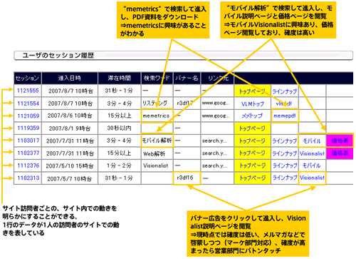 アクセス解析を利用すれば、ある見込客がどのような検索ワードで情報を探し、どのページを見て、どのくらいWebサイトに滞在していたかがわかる。またその見込客のWebサイト訪問回数や訪問頻度も把握できる。このような情報に基づき、個々の見込客のニーズや受注確度、アプローチのタイミングを予測し、アプローチの優先順位を付けることで、営業効率を高めているのだ。