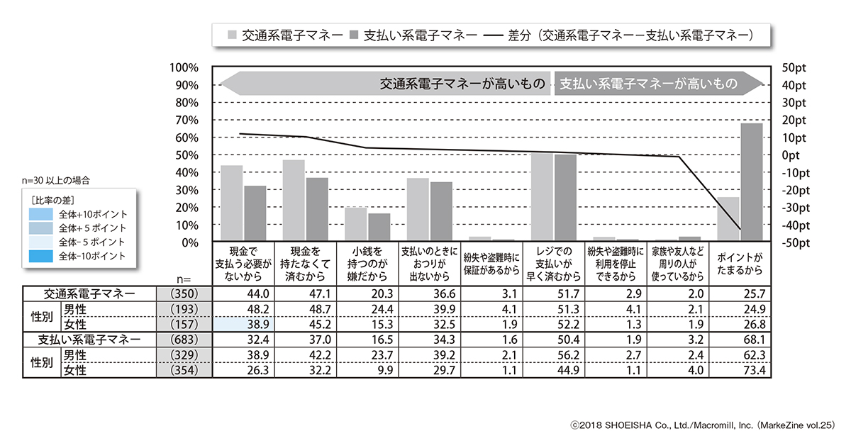 電子マネーユーザーが電子マネーを利用する理由は、交通系電子マネーでは「レジでの支払いが早く済むから」52%、「現金を持たなくて済むから」47%、「現金で支払う必要がないから」44%と、“利便性”を理由に利用されている。また、支払い系電子マネーは「ポイントがたまるから」が68%で突出して高く、“お得感”といった理由で使われている。特に女性ユーザーの73%は「ポイントがたまるから」と回答しており、男性よりも11ポイントも高かった(図表4)。