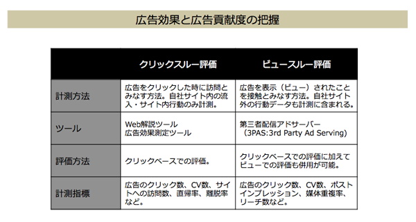 広告貢献度の把握する方法は大きくわけて2つあります。1つはWeb解析ツールや広告効果測定ツールを活用しクリックした広告の貢献度を割り振るクリックスルーでの評価。もう1つは、広告のインプレションの情報も加味しビュースルーも含めた評価。