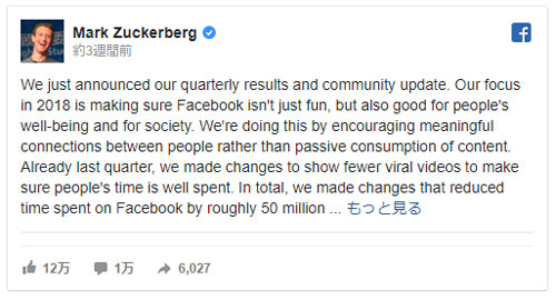 ちなみに、投稿の中では「バイラルビデオの表示を減らしたことで Facebook での滞在時間を1日あたり約5,000万時間減少させた」(意訳)とコメントしており、現在はコンテンツの内容より “そのコンテンツがどれだけ意味のあるリアクションを発生させたか” を重視して優先順位付けをするよう指示しているとのことです。
