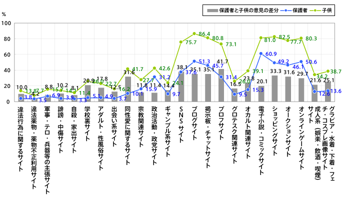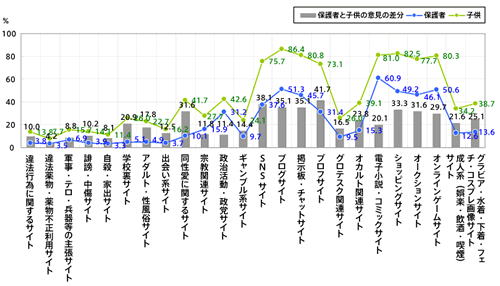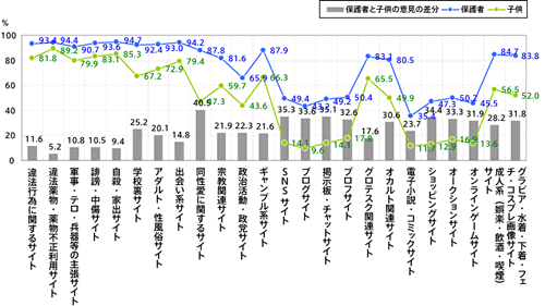 規制すべきサイト、保護者と子供の意識差が高いのは「同性愛」「SNS」「掲示板・チャット」